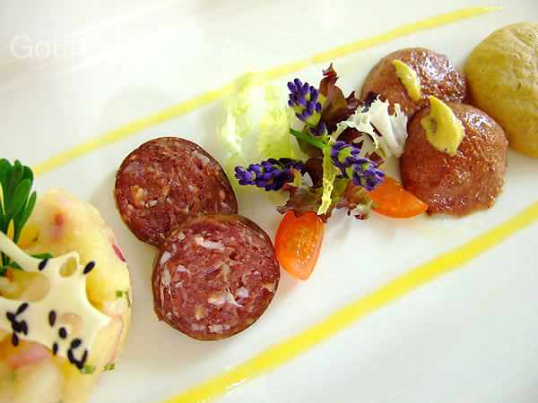 Saucisson de gibier fumé au salade de pommes de terre et pain croustillant de seigle