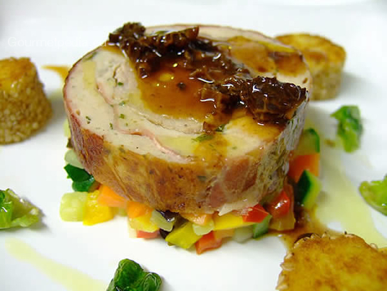 Bistec de ternera envuelto en jamón crudo con verduras salteadas y salsa de morillas