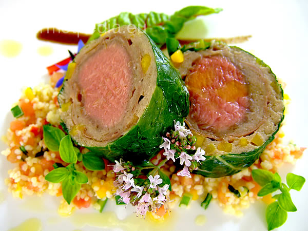 Lamb fillet in a raw ham and chards coat on spicy vegetable couscous