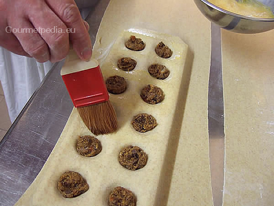 • Die Ränder der Teigtaschen mit verquirlten Ei bestreichen