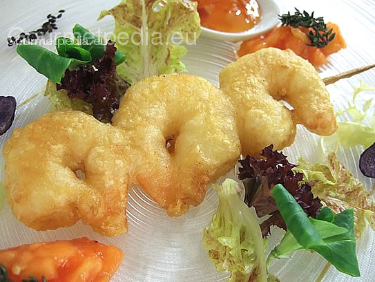 Spiedino di gamberoni fritti in pastella tempura con tartara di papaya
