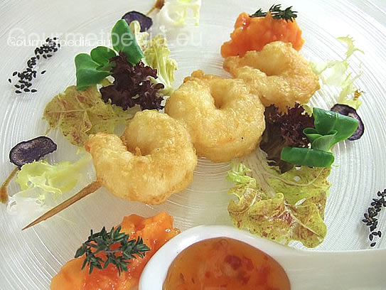 Brochette aux gambas en pâte "tempura" à frire avec la tartare de papaye