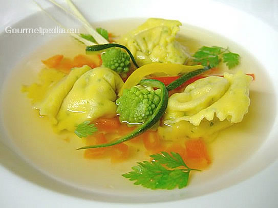Consommé con ravioli alle erbe fini fresche e verdurine