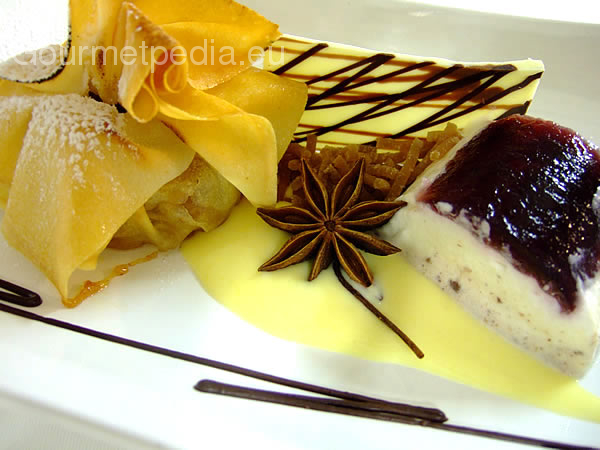 Sachet of strudel pastry stuffed with quince apple on star anise sauce and chestnut parfait