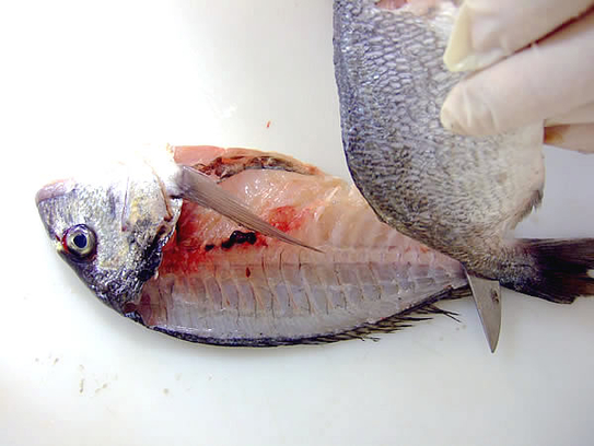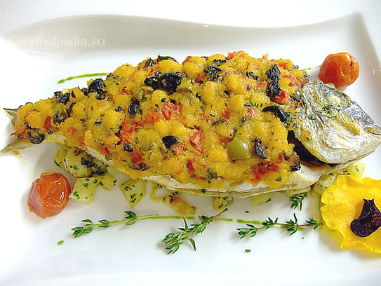 Die Tomate kreuzweise einschneiden und kurz in kochend heißes Wasser legen, bis sich die Haut abziehen lässt, in Eiswasser zum Abkühlen geben und häuten. Schneiden Sie von der Tomate das Fruchtfleisch heraus, benützen dieses eventuell für eine Fleischsuppe und schneiden das restliche Fruchtfleisch der Tomate in kleine Würfel. Schneiden Sie das Weißbrot und die Oliven ebenfalls in Würfel und geben sie zu den Tomaten. In einen kleinen Topf den Knoblauch im Butter anschwitzen und dann mit dem Olivenöl, der Petersilie mit Salz und Pfeffer zu der Brotmasse geben. Vermischen Sie alle Zutaten, verteilen sie dann auf den Goldbrassen und drücken die Masse leicht an. Legen Sie die Fische auf ein gefettetes Backblech und backen sie im vorgeheizten Heißluftofen bei 175 Grad für 12 Minuten.