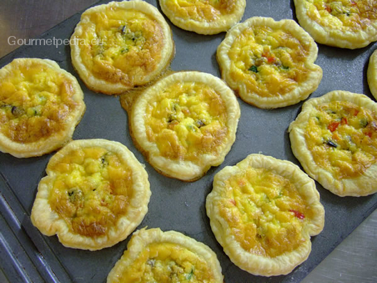 Der Blätterteig dünn auf ca. 1.5 mm ausrollen, vier Förmchen mit Butter oder Trennfett ausfetten und mit den in 4 Stücken, rund oder viereckig zugeschnittenen Teig auslegen. Das Backrohr auf 180 Grad vorheizen. Das Gemüse mit dem in Würfel geschnittenen Käse in den Förmchen verteilen, den Guß aus der Sahne, dem Ei, Salz, Pfeffer und Parmesan verühren und darüber gießen. Im Backrohr für ca. 30 Minuten backen.