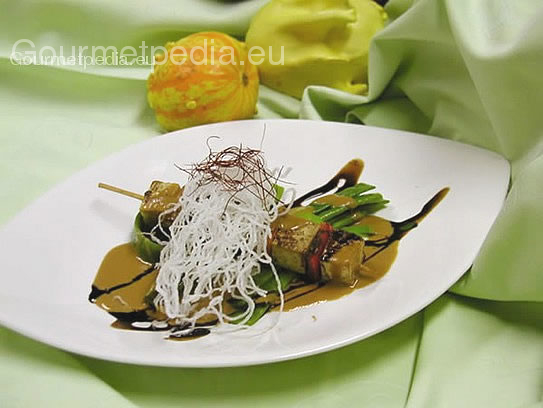 Brochette of tofu with fried chinese noodles on soy cream sauce