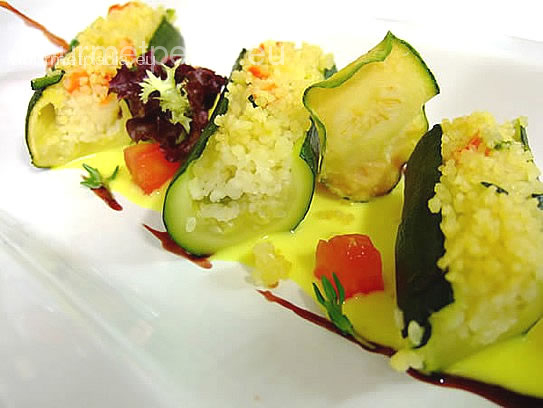 Calabacines rellenos con cuscús de verduras a la salsa de azafrán