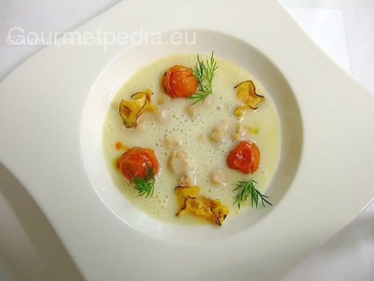 Cream of kohlrabi soup with sautéed calf's sweet breads
