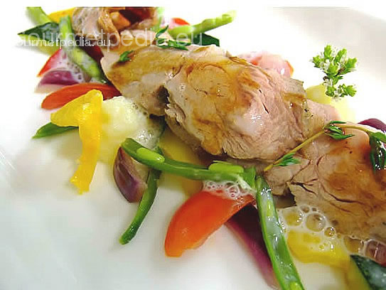 enRoast slice of veal with sauteed vegetables and thyme sauce