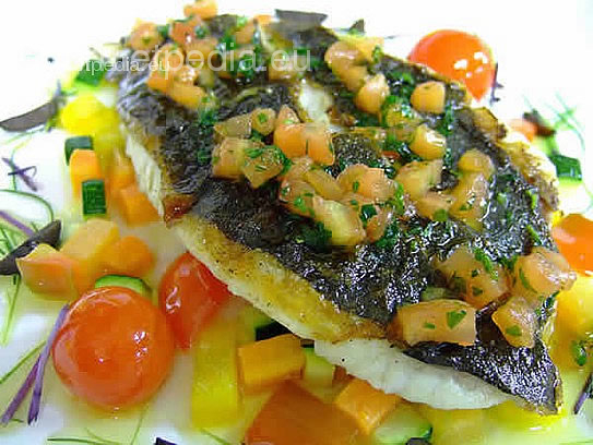 Grilled fillet of turbot with tomatoes and olives on sautéed vegetables