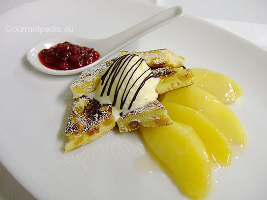 Omelette rissolée au airelle rouge avec la glace à la vanille et la compote tiède de pommes