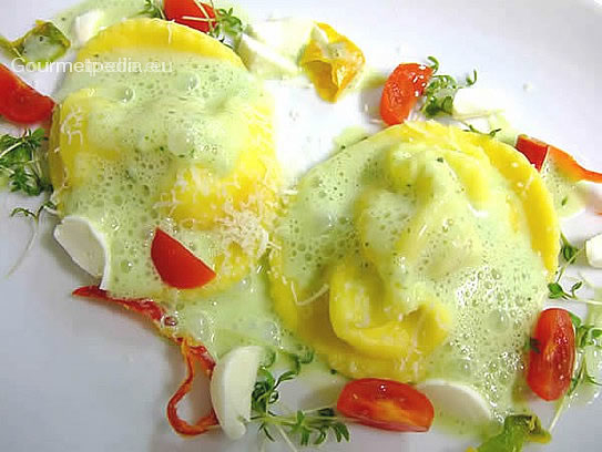 Ravioli stuffed with cherry tomatoes and mozzarelline on basil sauce